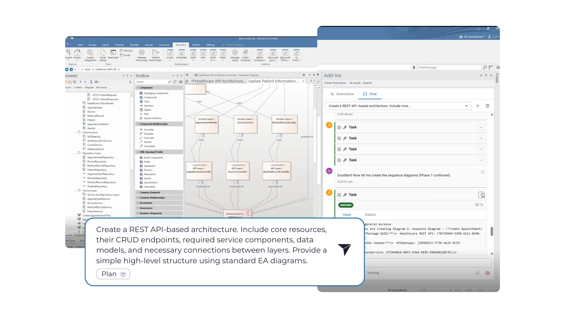 Create, modify, and query enterprise architecture elements directly within Sparx Systems Enterprise Architect using natural language. AI Assist works on live repositories, helping architects author and evolve models faster while maintaining structural integrity, MDG compliance, and governance controls.